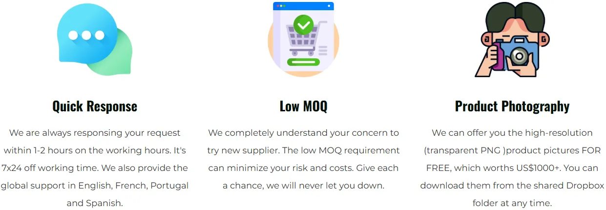 We can offer you the high-resolution (transparent PNG )product pictures FOR FREE, which worths US$1000+. You can download them from the shared Dropbox folder at any time.