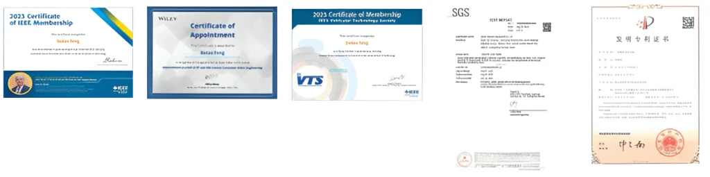 Our certificates include RoHS compliance, 20 patents, IEEE senior member status, and Wiley Editor recognition…