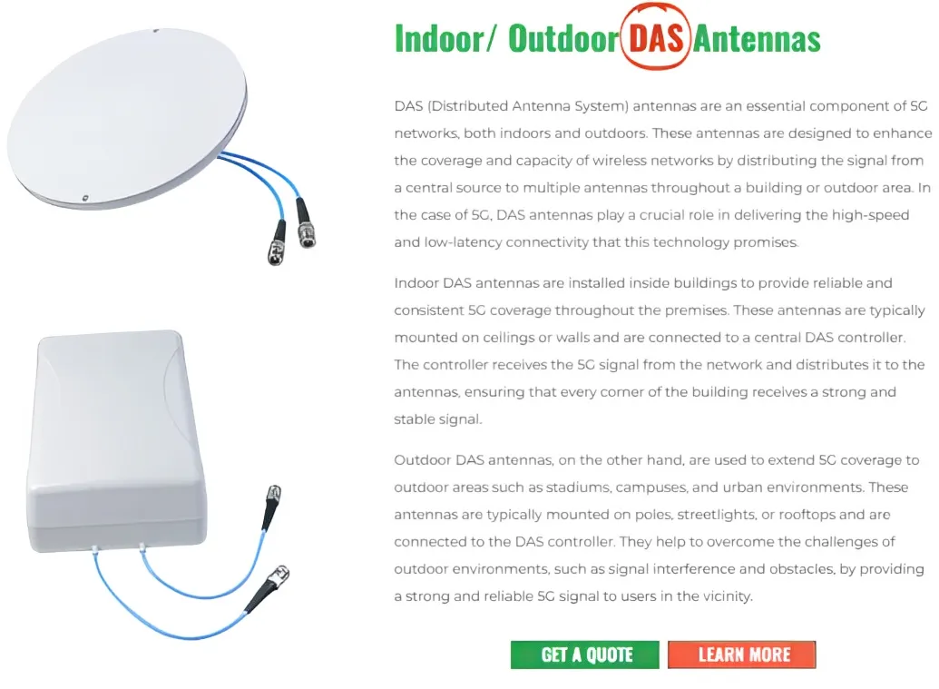 DAS (Distributed Antenna System) antennas are an essential component of 5G networks, both indoors and outdoors. These antennas are designed to enhance the coverage and capacity of wireless networks by distributing the signal from a central source to multiple antennas throughout a building or outdoor area. In the case of 5G, DAS antennas play a crucial role in delivering the high-speed and low-latency connectivity that this technology promises.